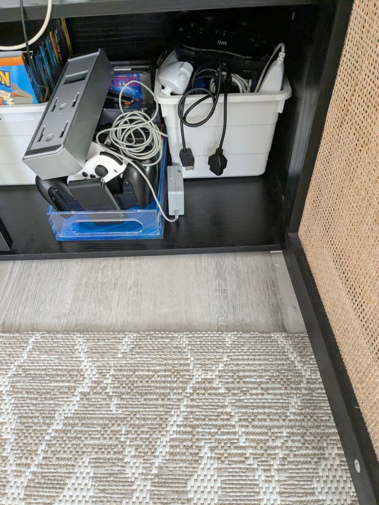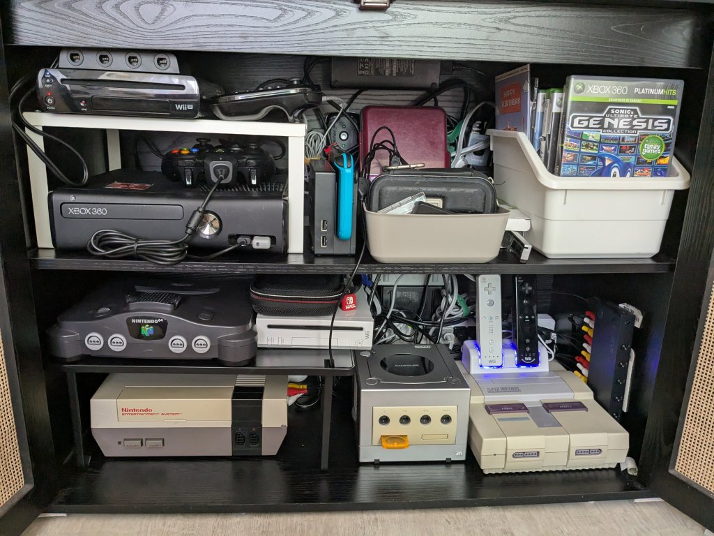 I like retro video games a lot and I collect game consoles. At the moment, I have seven TV consoles, five handhelds, and a Nintendo Switch making a total of Thirteen gaming devices not including my two laptops. Because I play on all my systems, I have two power strips, two HDMI splitters, and an analog to digital video converter that has four sets of composite inputs, and the RF switcher for my SNES to make sure all my consoles are hooked up at all times. Also, I have a Wii remote charger and rechargeable battery packs for my Wii remotes and a Play & Charge kit for my XBOX 360 controller to make sure my controllers are never out of batteries. I even have one of those adapters that lets me use Gamecube controllers with my Wii U for when I play Super Smash bros. with friends. All of these things plus bins and trays to keep all my accessories, games, and handhelds organized make my gaming setup ready to go. My advice to anybody trying to set up their own gaming setup is to velcro the AC adapters for your Wii, Wii U, XBOX 360 s/e, etc. to the wall so they don’t take up space that you can use to store other stuff. Also, don’t use the Wii U gamepad dock because it takes up too much space and instead plug the AC adapter into the port on top of the gamepad.