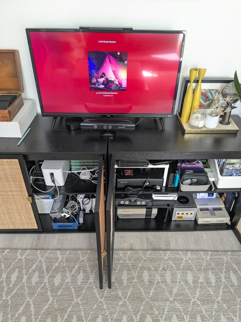 My gaming setup with a view of our 32″ TCL Roku TV, some of our living room decor, and a random pencil.