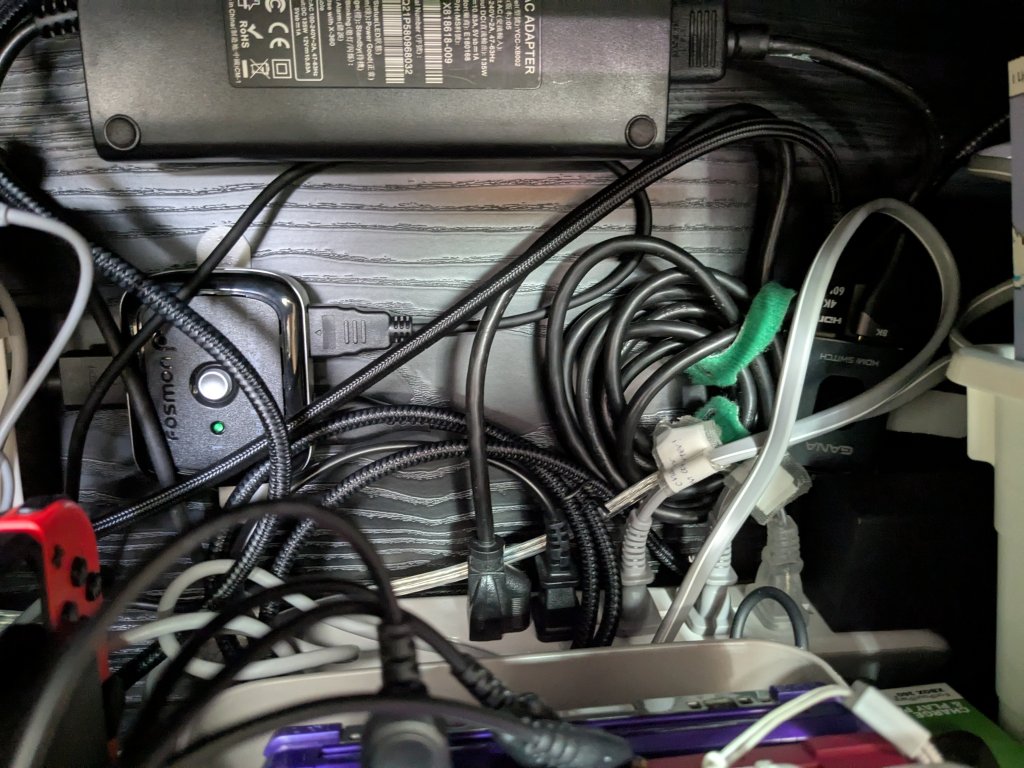 I like retro video games a lot and I collect game consoles. At the moment, I have seven TV consoles, five handhelds, and a Nintendo Switch making a total of Thirteen gaming devices not including my two laptops. Because I play on all my systems, I have two power strips, two HDMI splitters, and an analog to digital video converter that has four sets of composite inputs, and the RF switcher for my SNES to make sure all my consoles are hooked up at all times. Also, I have a Wii remote charger and rechargeable battery packs for my Wii remotes and a Play & Charge kit for my XBOX 360 controller to make sure my controllers are never out of batteries. I even have one of those adapters that lets me use Gamecube controllers with my Wii U for when I play Super Smash bros. with friends. All of these things plus bins and trays to keep all my accessories, games, and handhelds organized make my gaming setup ready to go. My advice to anybody trying to set up their own gaming setup is to velcro the AC adapters for your Wii, Wii U, XBOX 360 s/e, etc. to the wall so they don’t take up space that you can use to store other stuff. Also, don’t use the Wii U gamepad dock because it takes up too much space and instead plug the AC adapter into the port on top of the gamepad.